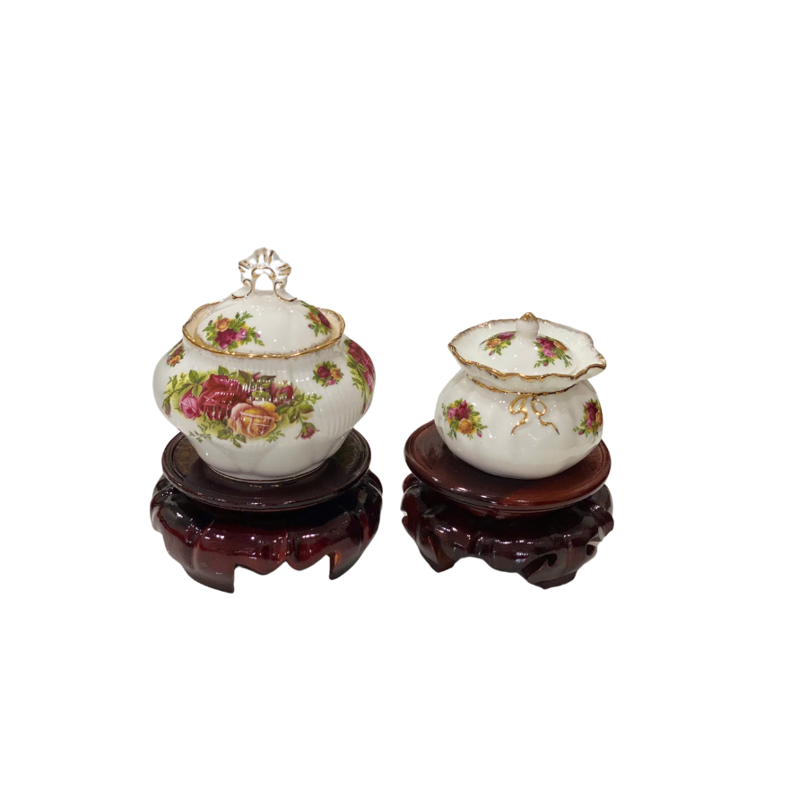 Hai hũ sứ nhỏ xinh trong ảnh là những món đồ sưu tầm kiểu Anh, nổi bật với họa tiết hoa hồng cổ điển – một biểu tượng vượt thời gian của sự thanh lịch, lãng mạn và nghệ thuật sống quý tộc từ châu Âu thế kỷ 20.
